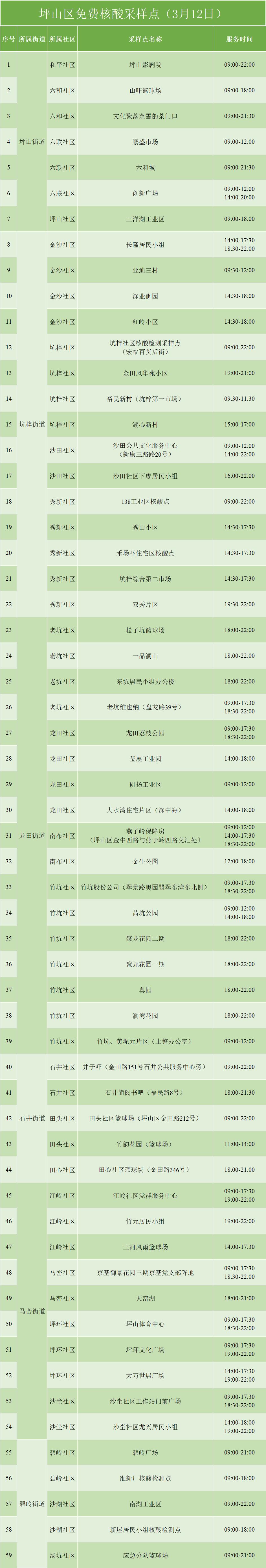 坪山区设置了多个核酸采样点