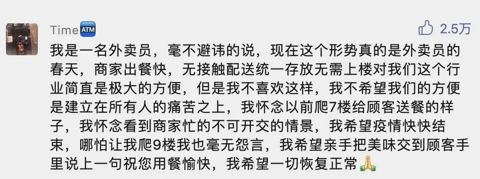 我是一名外卖员,毫不避讳的说,现在这个形势真的是外卖员的春天,商家出餐快,无接触配送统一存放无需上楼对我们这个行业简直是极大的方便,但是我不喜欢这样,我不希望我们的方便是建立在所有人的痛苦之上,我怀念以前爬7楼给顾客送餐的样子,我怀念看到商家忙的不可开交的情景,我希望疫情快快结束,哪怕让我爬9楼我也毫无怨言,我希望亲手把美味交到顾客手里说上一句祝您用餐愉快,我希望一切恢复正常。