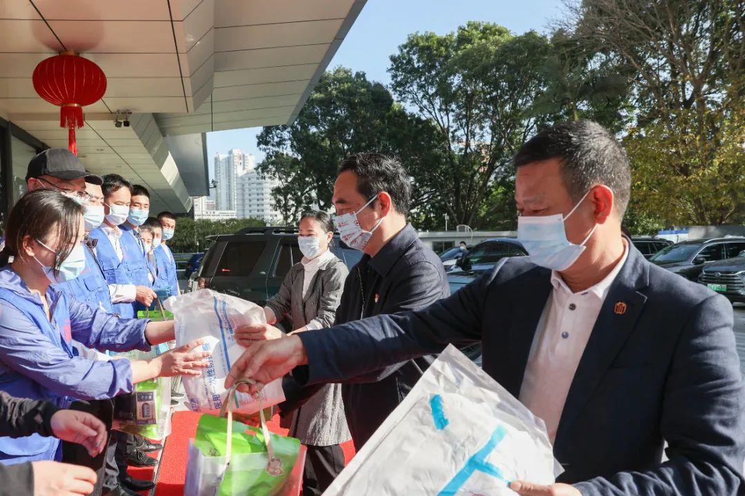 △福田区总工会副主席刘东升为志愿者送上防疫用品。