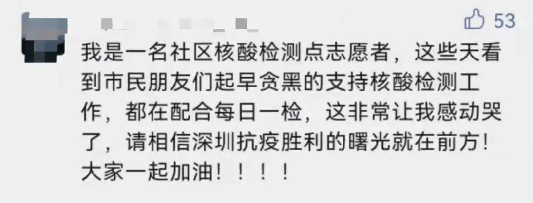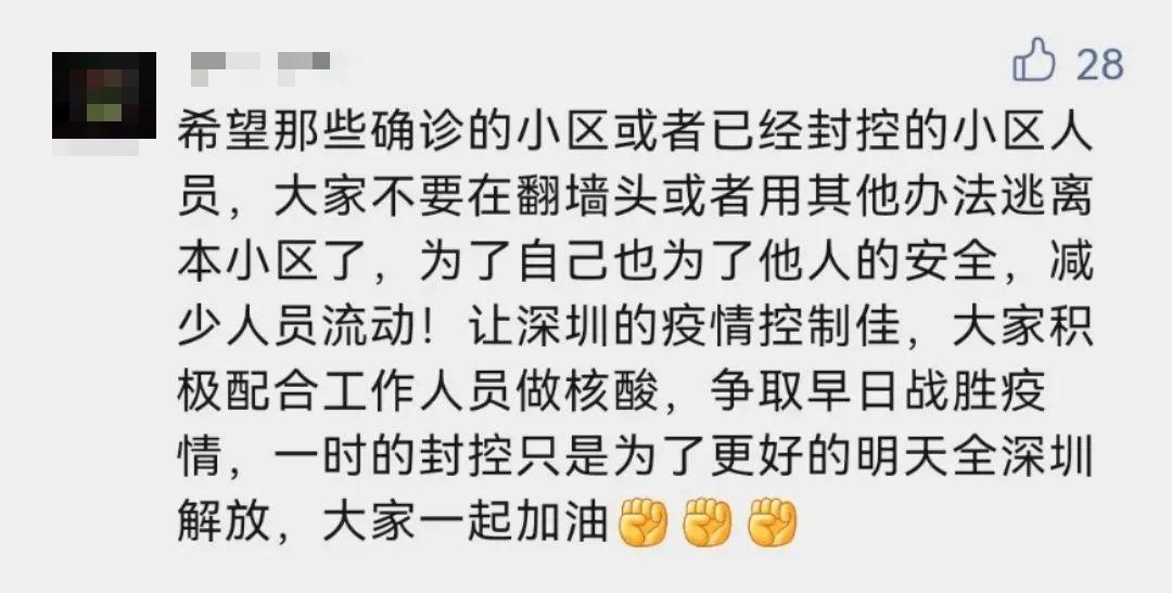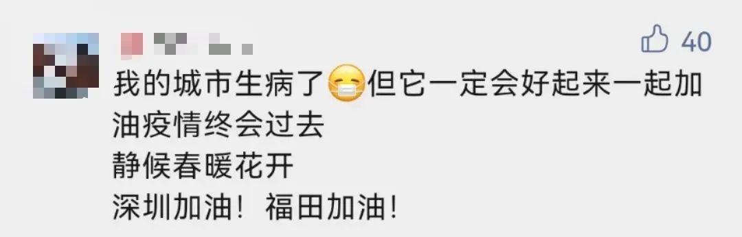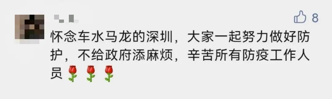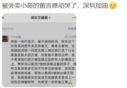 " 我也看到那个留言了,深圳虽说大家都戏称自己是打工人,但是大家都希望看见这个城市变好,哪怕有天离开了,也会有美好的印象留下 "," 除了医护人员和志愿者很辛苦,还有这些外卖小哥也辛苦,因为他们的存在,让我们足不出户也能吃到喝到好吃的,更加让不会做的宝宝们不至于饿肚子 "," 快递,外卖,从来不催。因为都是打工人,都不容易,更何况在目前的严峻形势下,更要彼此多一份理解 "……