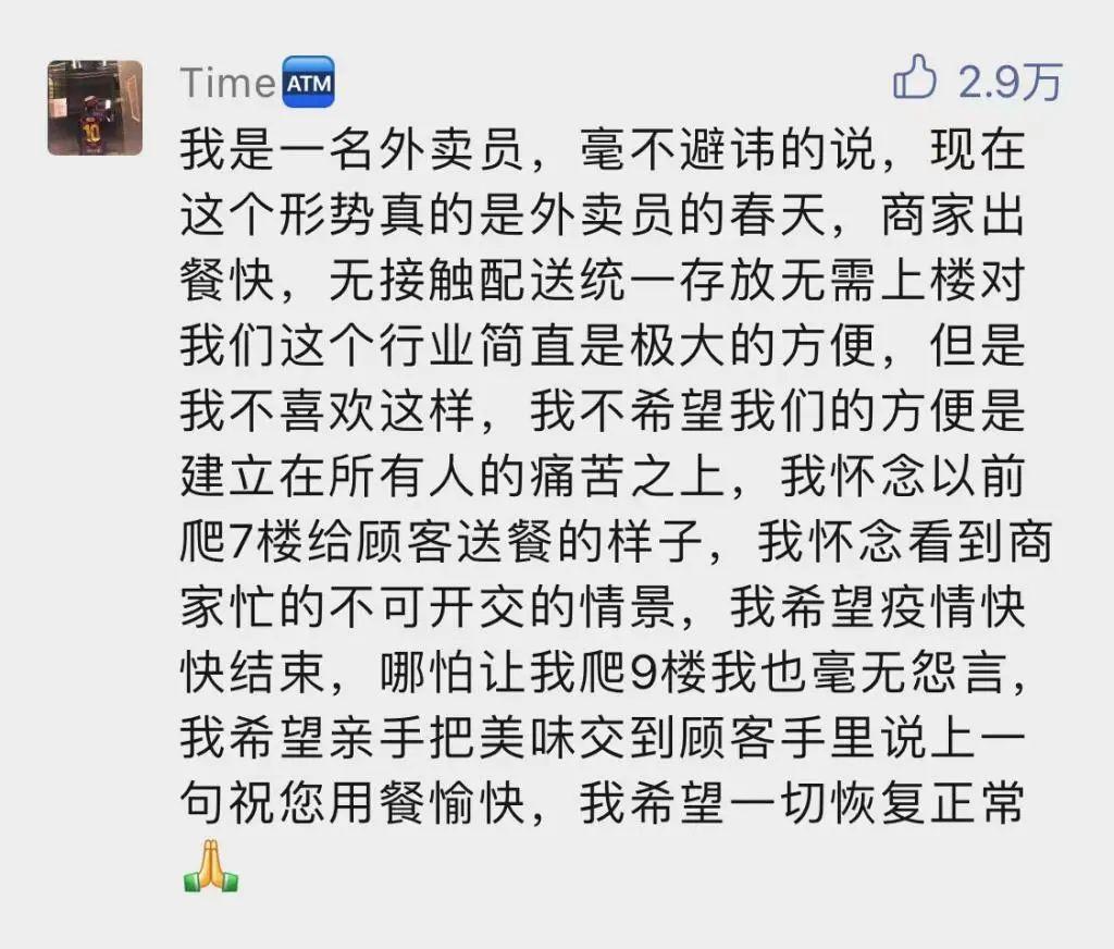 " 我是一名外卖员,毫不避讳的说,现在这个形势真的是外卖员的春天,商家出餐快,无接触配送统一存放无需上楼对我们这个行业简直是极大的方便,但是我不喜欢这样,我不希望我们的方便是建立在所有人的痛苦之上,我怀念以前爬 7 楼给顾客送餐的样子,我怀念看到商家忙的不可开交的情景,我希望疫情快快结束,哪怕让我爬 9 楼我也毫无怨言,我希望亲手把美味交到顾客手里说上一句祝您用餐愉快,我希望一切恢复正常。"