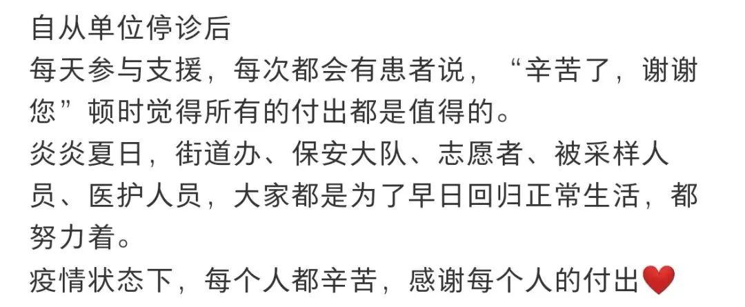 面对反反复复的疫情,大家都很不容易,都在为疫情防控尽份力,没有人置身事外。更关键在于,大家在努力的同时,都还觉得自己的这点不算什么,从内心深处体谅与感激身边更多人的付出与奉献。