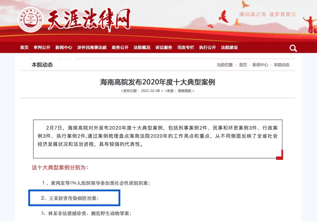 我们以“海南高院发布2020年度十大典型案例之二:王某妨害传染病防治案”为例来分析: