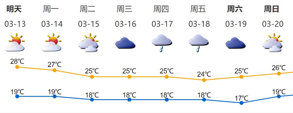 13-15日晴天到多云,天气温暖,早晚有轻雾或雾,13日气温19-28℃;