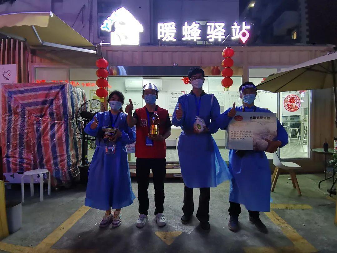 △图:工作至晚上的、滞留在城中村的志愿者们获赠夏凉被、巧克力、方便面、油、防疫物资等物品