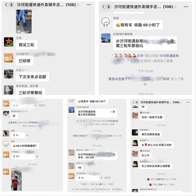 来自中通、京东、饿了么、美团、顺丰的骑手志愿者共27人迅速集结,分小组负责转接物资、协助核酸检测等工作。