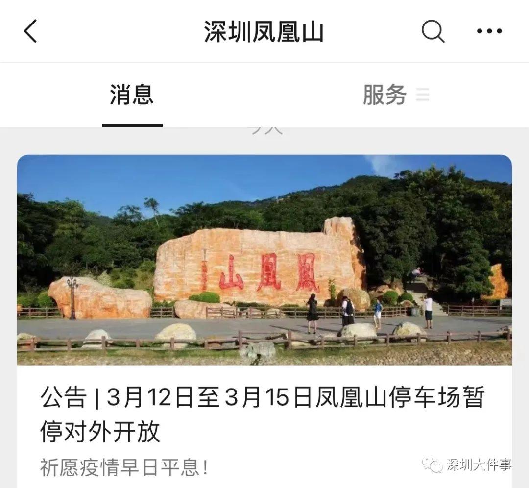 根据当前疫情防控形势,为坚决有效阻断疫情传播,保障广大市民身体健康和生命安全,减少因人员聚集带来的疫情传播风险,2022年3月12日至3月15日期间,凤凰山停车场暂停对外开放,具体开放时间将另行通知。各位市民和游客朋友可关注“深圳凤凰山”微信公众号了解最新发布信息。