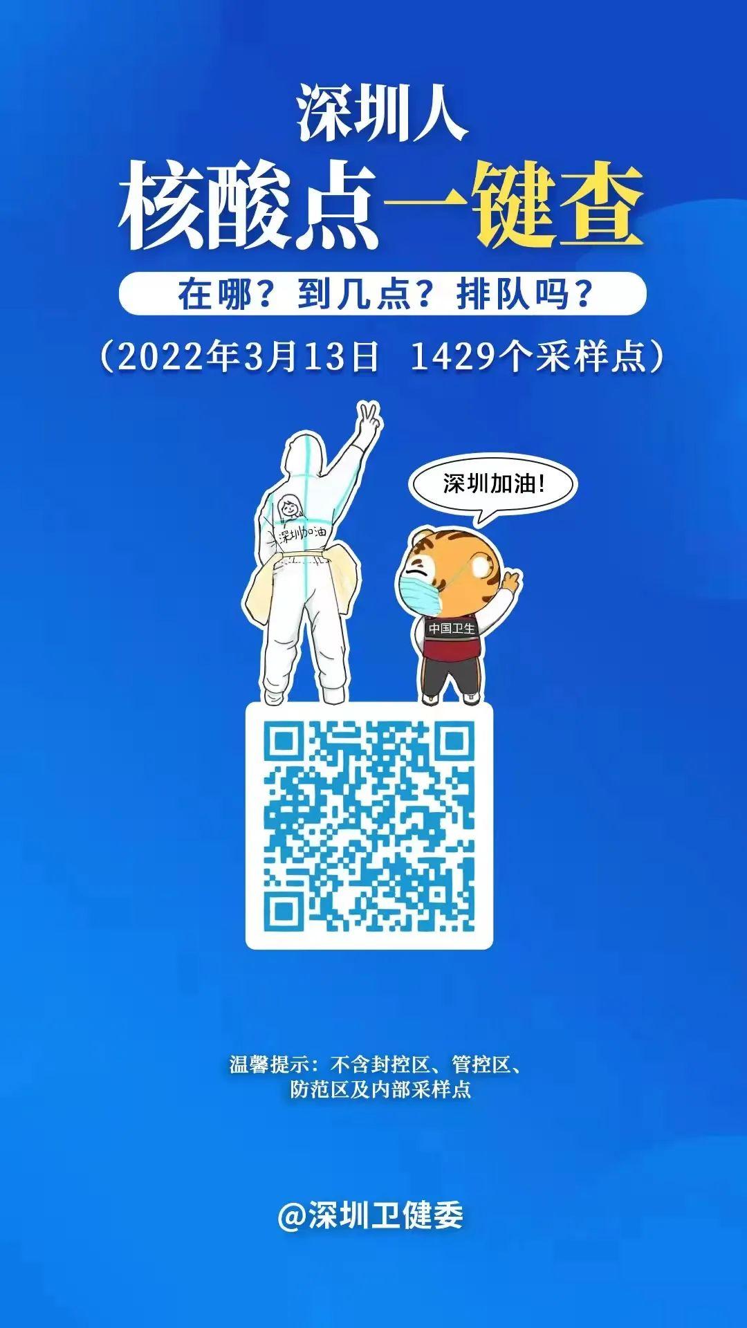 为方便居民进行核酸检测,3月13日,福田区设置98个免费的核酸检测采样点,为居民提供服务。