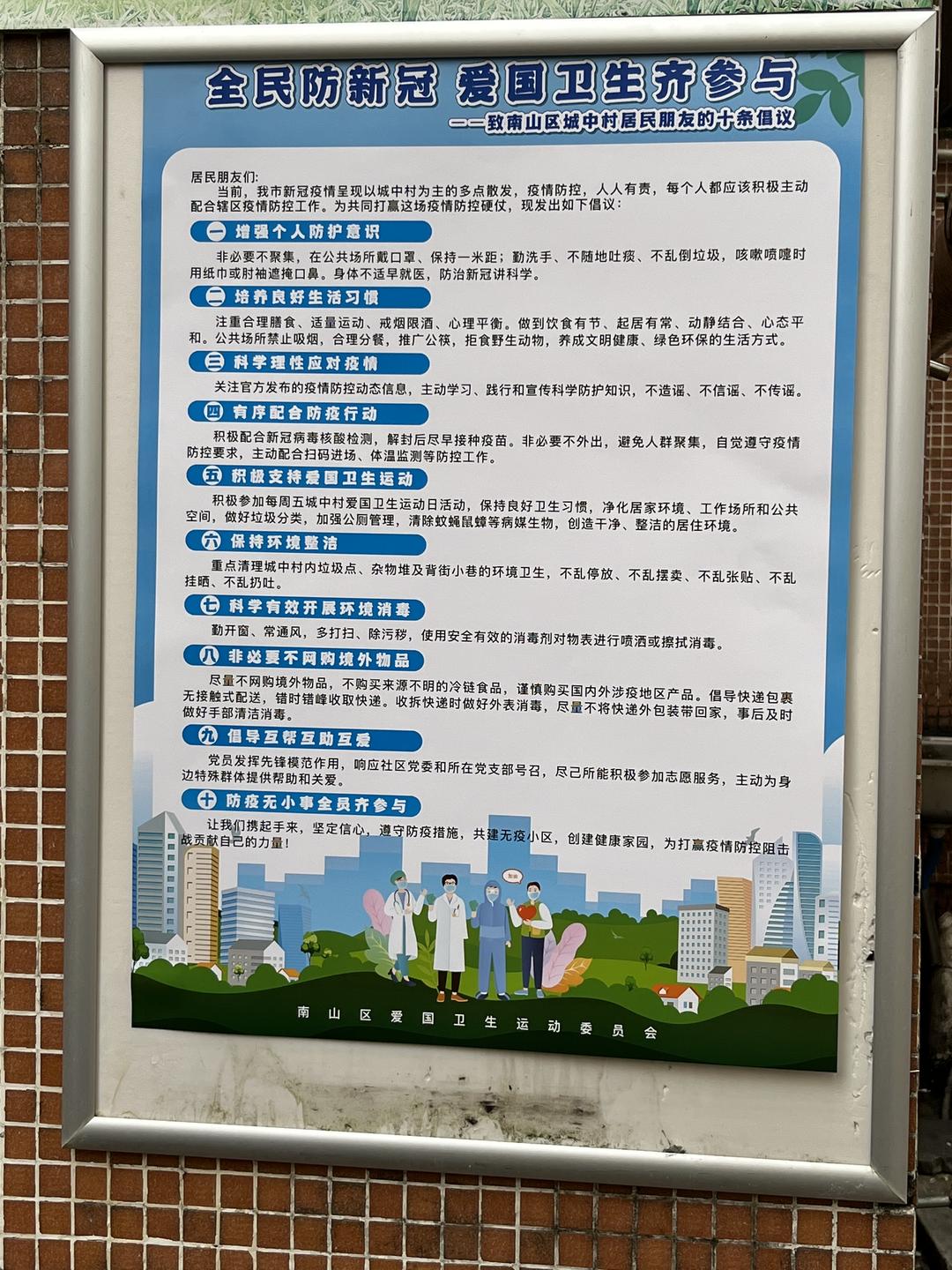 同时,南山区利用微信公众号、社区LED显示屏、宣传栏等载体,并印制宣传海报2000份,加强健康知识宣传,倡导城中村居民坚持不聚集、勤通风、常锻炼、用公筷、一米线等健康生活方式,引导做好卫生清理、消毒和个人防护。