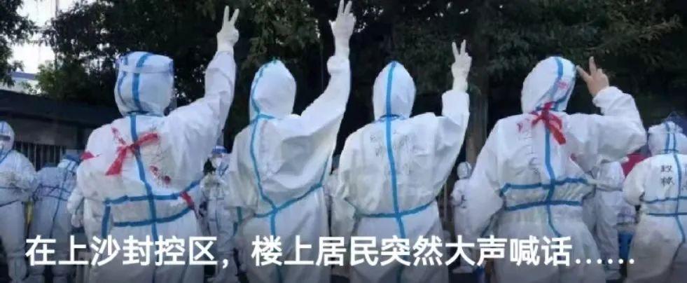 “ 上沙居民在阳台边和抗疫人员互喊加油的