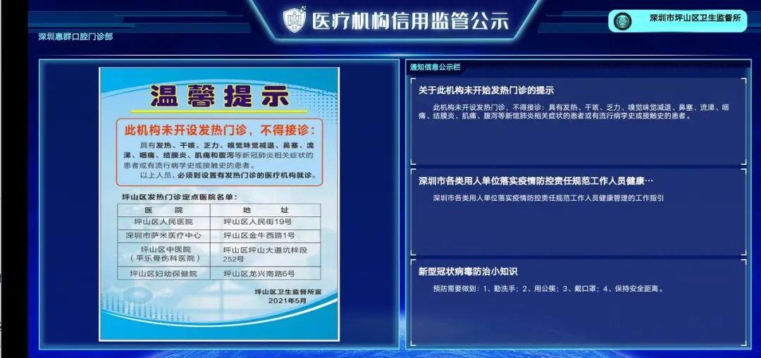在75家重点医疗机构,坪山安装了“医疗机构信用信息公示系统”显示终端,定制疫情防控知识,精准推送至各社会办医疗机构大厅显示屏,要求各机构开展工作人员疫情防控知识培训,提升疫情防控意识,督促各机构严格落实预检分诊、院感控制、消毒管理、个人防护等各项防控措施。