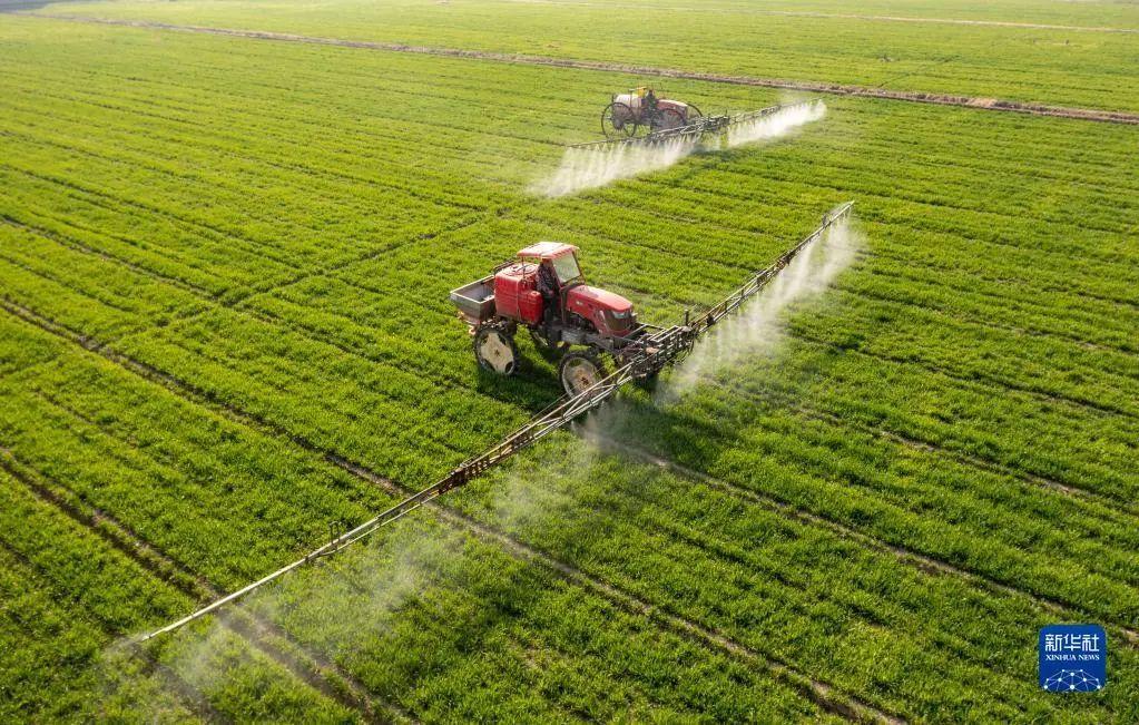 2022年3月9日,在江苏省海安市大公镇贲集村,村民驾驶植保机械在小麦田间进行喷洒药物作业(无人机照片)。新华社发(翟慧勇 摄)
