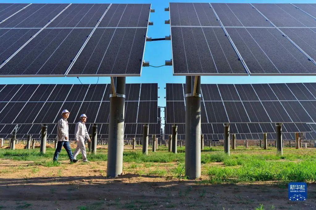 工作人员在内蒙古自治区鄂尔多斯市伊金霍洛旗天骄绿能50万千瓦采煤沉陷区生态治理光伏发电示范项目区里巡查(2021年7月8日摄)。新华社发(王正 摄)