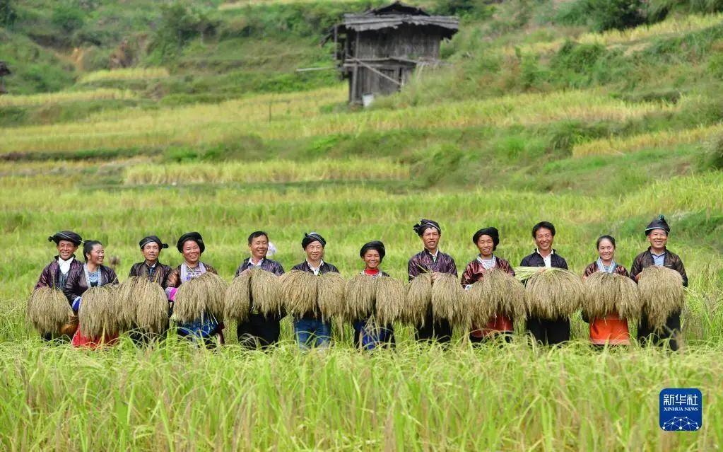 在广西融水苗族自治县良寨乡大里村,村民们展示刚刚收割的脱贫特色产品——紫黑香糯(2018年10月12日摄)。新华社记者 黄孝邦 摄
