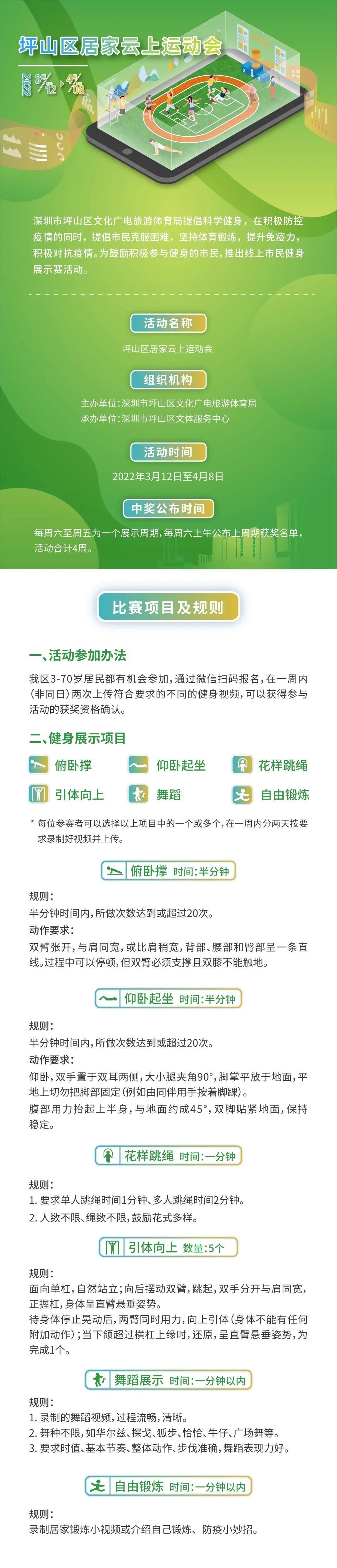 在防疫常态化下,为提倡市民养成坚持居家运动的良好习惯,增强身体素质,带动家人、亲友和身边的人积极参与居家健身,共同营造自觉锻炼、主动健身、增强抵抗力,营造健康、活力的社会新风尚,坪山区文化广电旅游体育局推出“坪山区居家云上运动会”,开启云端运动模式,带来别样的运动体验。