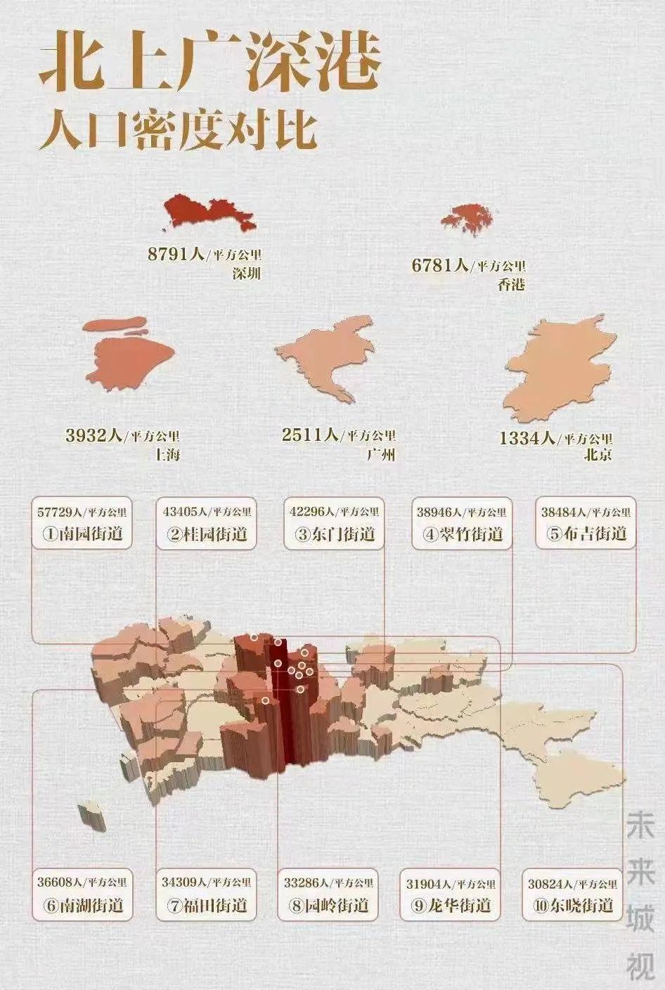 网上热传的《北上广深港人口密度对比》图显示,北京人口密度1334人/平方公里,上海3932人/平方公里,深圳是8791人/平方公里,是国内人口密度最大城市,超过了香港的6781人/平方公里。