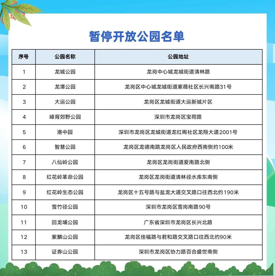 自2022年3月14日起,龙岗区以下公园暂停开放:龙城公园、龙潭公园、大运公园、嶂背郊野公园、港中园、智慧公园、八仙岭公园、红花岭革命公园、红花岭生态公园、雪竹径公园、回龙埔公园、紫麟山公园、证券山公园。