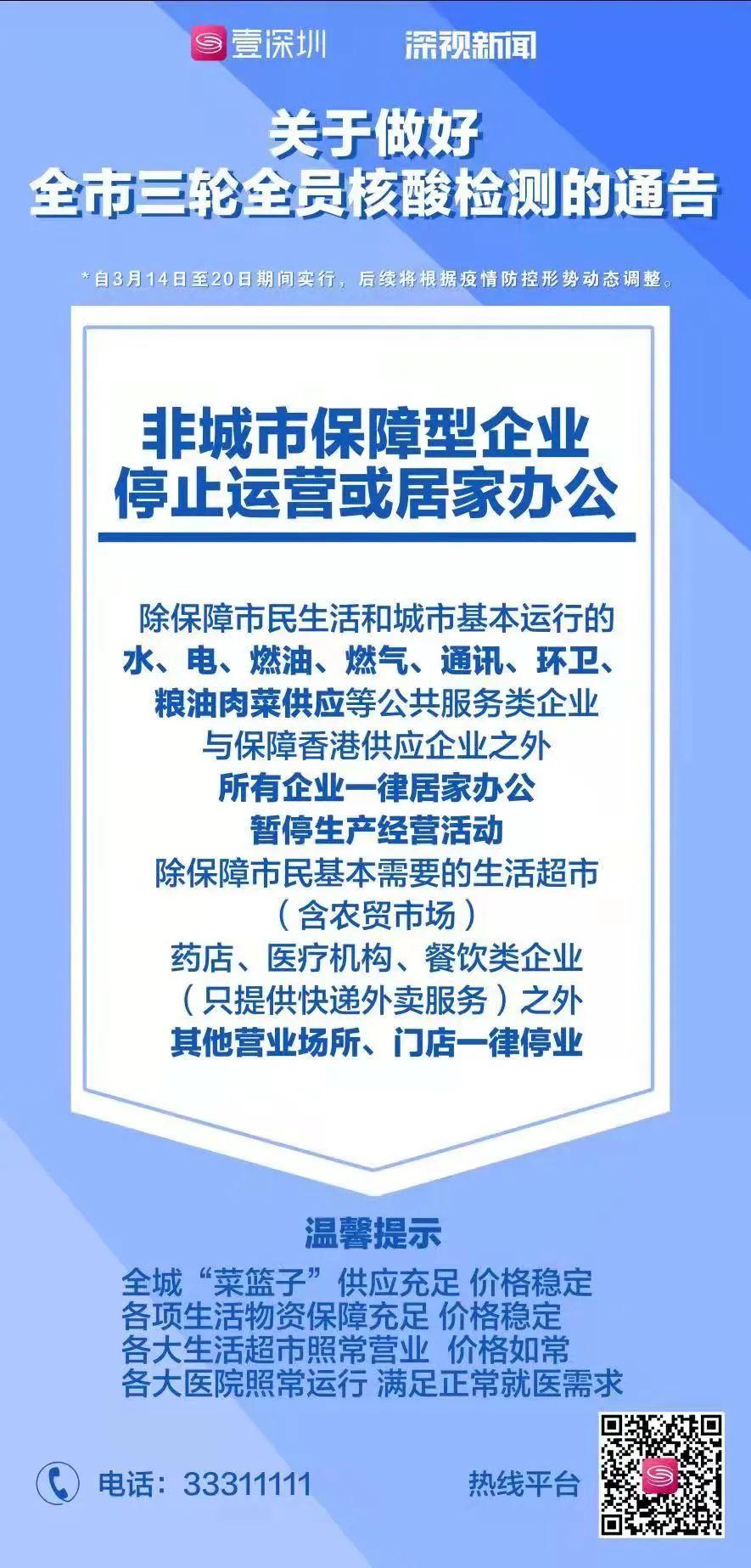 除保障市民生活和城市基本运行的水、电、燃油、燃气、通讯、环卫、粮油肉菜供应等公共服务类企业与保障香港供应企业之外,所有企业一律居家办公,暂停生产经营活动。这类企业可向所在街道申请特殊通行许可证。除保障市民基本需要的生活超市(含农贸市场)、药店、医疗机构、餐饮类企业(只提供快递外卖服务)之外,其他营业场所、门店一律停业。如遇此类问题,可及时向人力资源部门投诉(市人力资源保障局投诉电话0755-12333)。