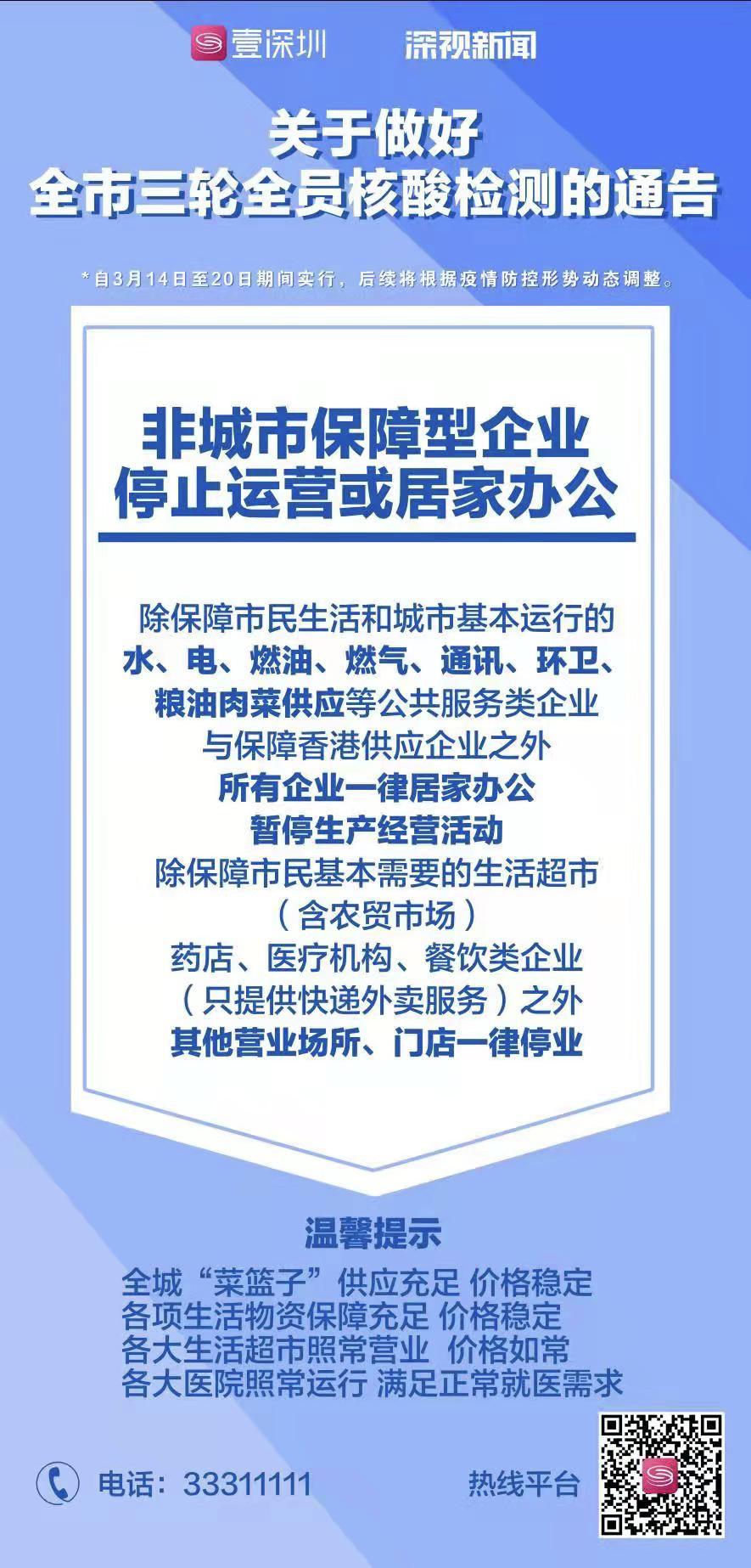 A:除保障市民生活和城市基本运行的水、电、燃油、燃气、通讯、环卫、粮油肉菜供应等公共服务类企业与保障香港供应企业之外,所有企业一律居家办公,暂停生产经营活动。这类企业可向所在街道申请特殊通行许可证。