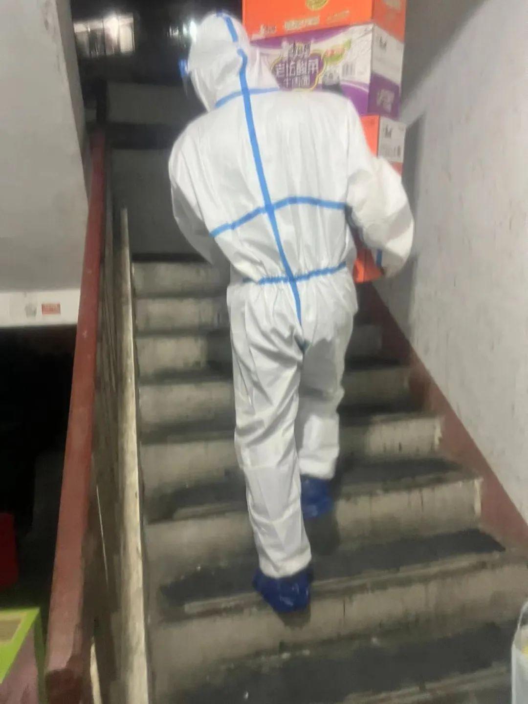 3月12日16时,穿着白色防护服的“快递员”张红又“接单”。张红是兰园小区管控区的一名业主,她和10余名志愿者、物业人员组成了“快递”业务组,专门负责为封控区的居民代送物品。这一次,她要爬楼给兰园小区18栋的居民送上新鲜的蔬菜和肉,“应该是为了晚饭做准备的,早点送去让居民安心。”