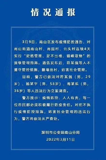 3月11日,深圳市公安局南山分局发布《情况通报》,全文如下:3月9日,南山区发布疫情防控通告,对南山街道南山村、南园村、北头村连续4天实行“定格管理、足不出楼、错峰取物”的提级管理措施。通告发布后,符某强等人不遵守管控措施,翻墙出村,妨害社会管理。目前,警方已依法对符某强(男,29岁)、杨某宇(男,58岁)、梅某乐(男,36岁)等人违法行为立案调查。警方提示:疫情防控,人人有责,每一位市民都必须积极履行防疫责任。对拒不执行疫情防控措施,妨害社会管理的违法行为,警方将依法从严查处。