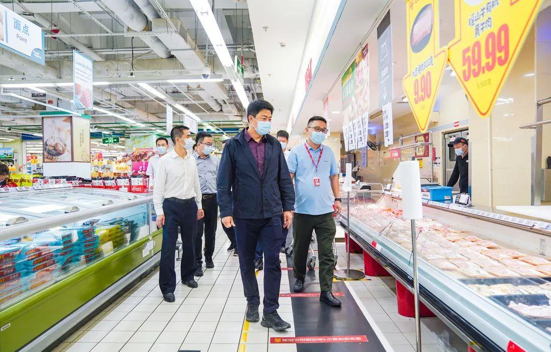 在华润万家大鹏迎宾店,刘广阳现场检查了疫情防控各项工作流程,并仔细询问生活物资供应、食品安全保障、冷链食品管控、物价等情况。