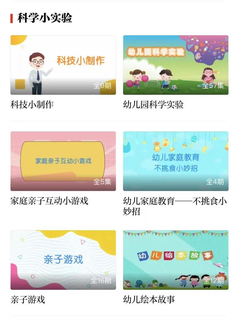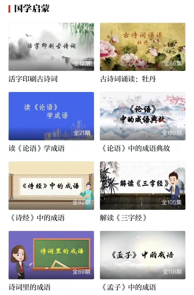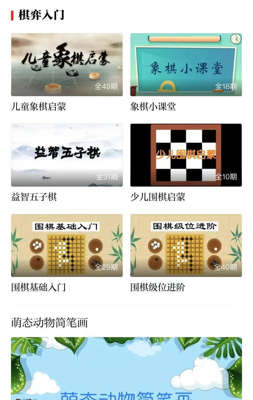 下滑页面,可见棋弈入门、国学启蒙、科学小实验、动物世界等专题。也可以利用页面顶部“搜索栏”对感兴趣的专题进行搜索。
