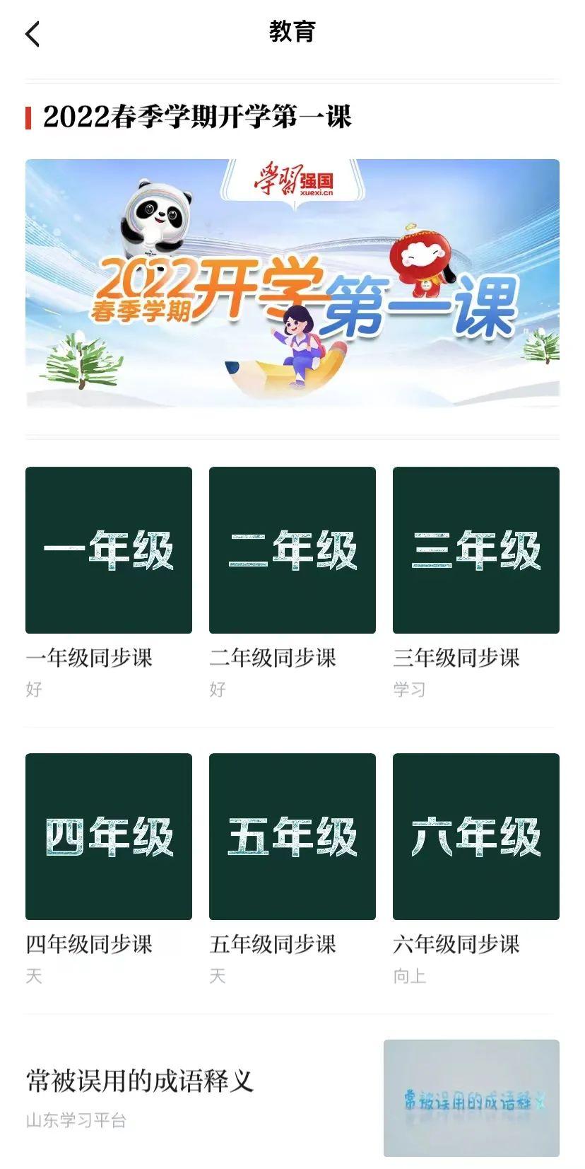 也可以滑动至下方,点击“2022年春节学期开学第一课”,选择对应年级的课程内容进行学习。