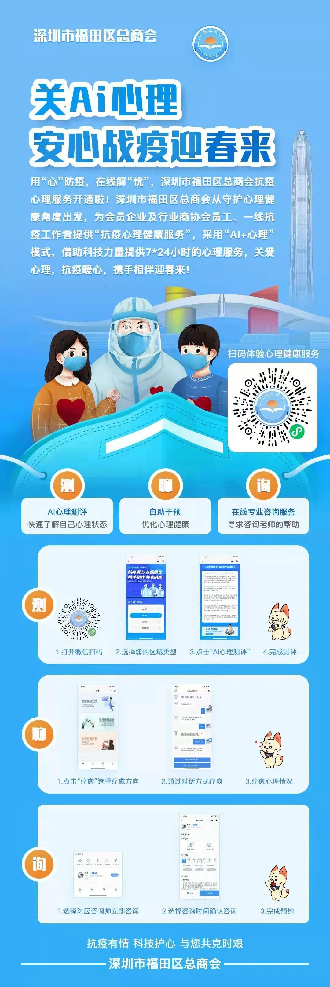 为了帮助会员企业及行业商协会员工、一线抗疫工作者缓解焦虑情绪,福田区工商联借助科技力量,推出集心理健康筛查、精准心理关爱、心理问题干预于一体的“抗疫心理健康服务”。