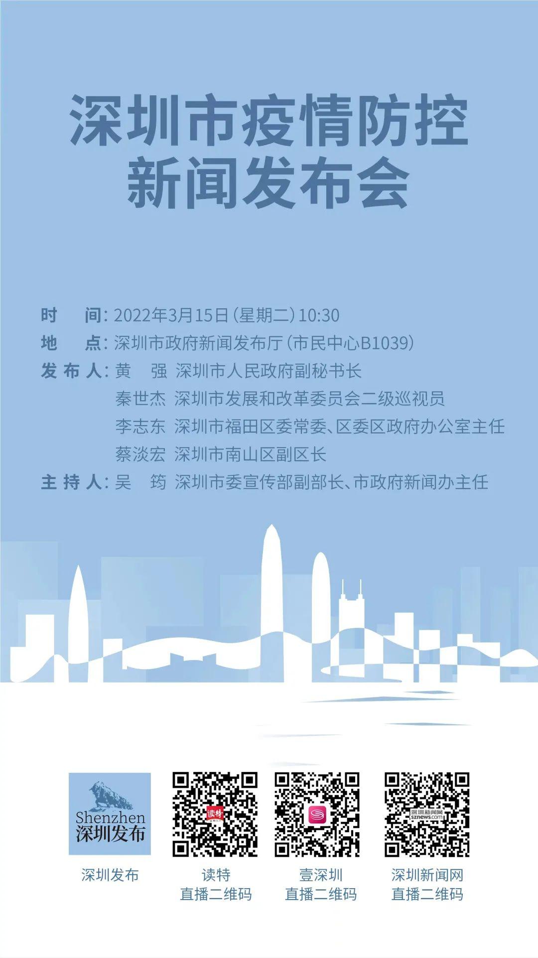 2022年3月15日(星期二)10:30,我市将举行疫情防控新闻发布会,邀请市人民政府、市发展和改革委员会、福田区、南山区有关负责人出席,通报我市疫情防控最新情况,并回答记者提问,敬请关注。