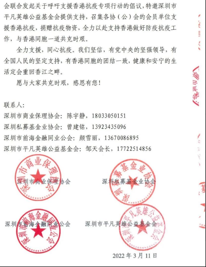 为支援香港抗疫,在深圳市前海管理局的指导支持下,深圳市商业保理协会、深圳私募基金业协会、深圳市前海金融同业公会3月11日联合发起关于呼吁支援香港抗疫专项行动的倡议,特邀深圳市平凡英雄公益基金会提供支持,召集各协(公)会的会员单位支援香港抗疫,捐赠抗疫物资,全力以赴支持香港做好防疫抗疫工作,与香港同胞一道共克时艰。