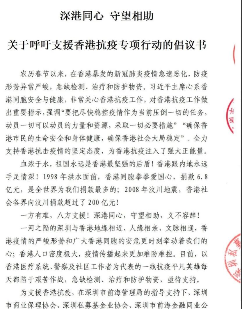 由这几家金融机构联合发出的题为《深港同心 守望相助——关于呼吁支援香港抗疫专项行动的倡议书》提出,血浓于水,祖国永远是香港最坚强的后盾!香港跟内地永远手足情深!一河之隔的深圳与香港地缘相近、人缘相亲、文脉相通,香港疫情的严峻形势和广大香港同胞的安危更时刻牵动着我们的心;香港人口密度极大,疫情传播起来更加难防难控。目前,以香港医疗系统、警察及社区工作者为代表的一线抗疫平凡英雄每天都陷于艰苦作战,急缺检测、治疗和防护物资,亟待支持。