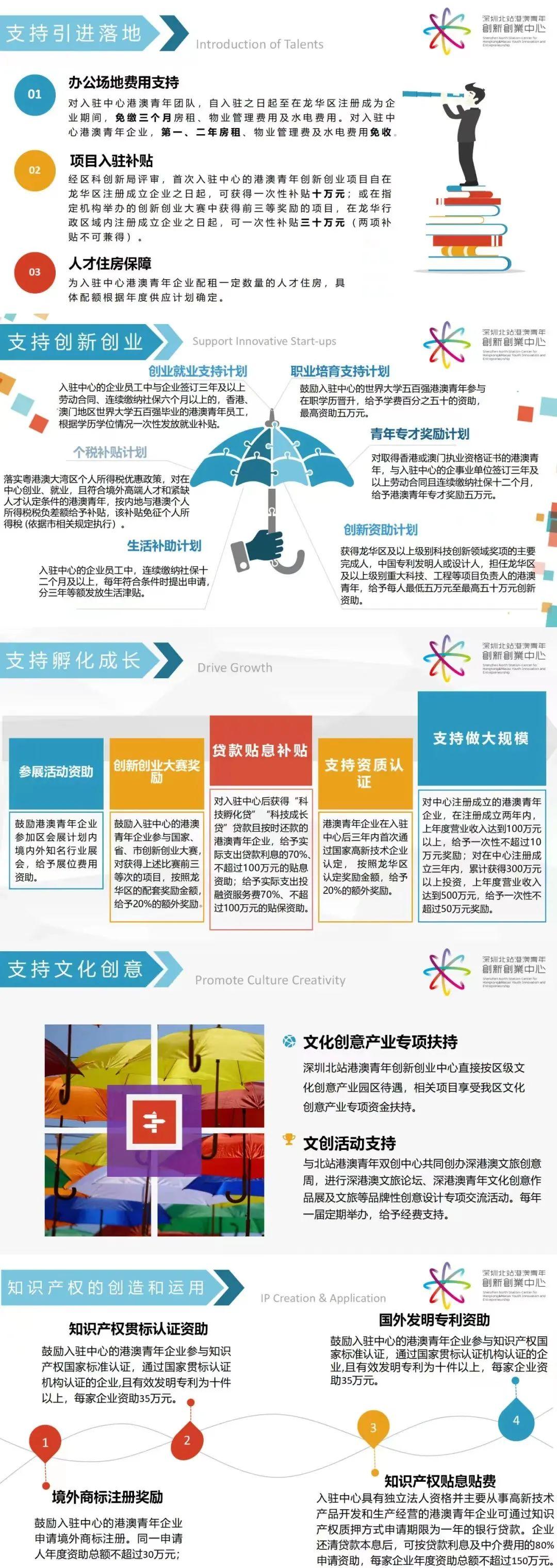 政策优势明显,专门制定引进落地、创新创业、孵化成长、文化创意、知识产权创造、运用及配套服务等事前补助优惠政策;产业优势突显,依托龙华产业大区优势,全面支撑资源引入、项目孵化成长,与区内港澳青年创新创业基地联动,形成“一中心多基地”发展格局;服务优势突出,提供现代化、智能化办公环境、贴心政务服务和综合配套保障,提供一站式、全链条、零距离的孵化服务;空间配套一应俱全,提供流动办公卡位、独立办公室、同心驿站、产品展示区、路演厅、会议室等智能化设备设施。