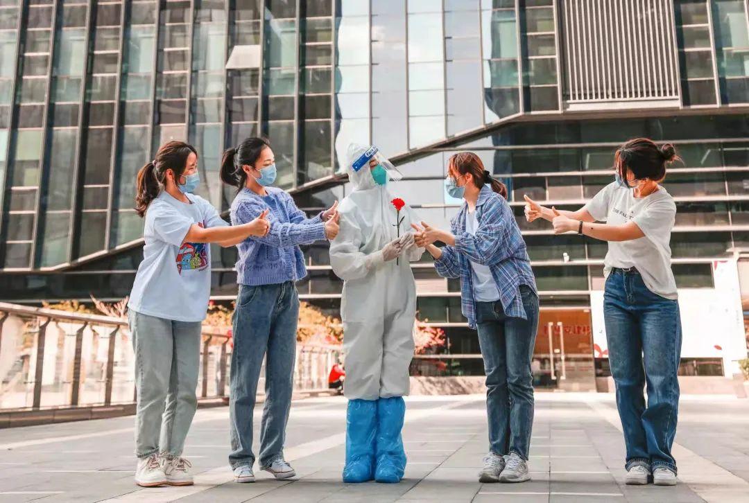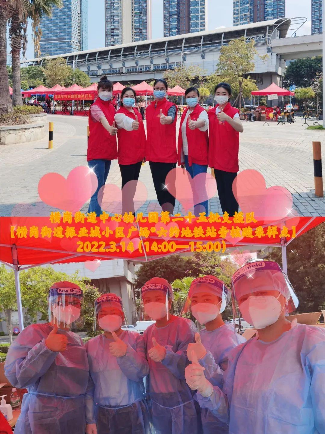 在龙岗区坂田街道岗头片区一核酸采样点,坂田街道万科城幼儿园的老师们为调节氛围,利用休息时间自编防疫舞蹈,将七步洗手法、戴口罩、保持一米距离等防疫元素融入其中,引导居民养成良好的防疫小习惯,自编自跳防疫舞蹈,同时也通过这个舞蹈向一线抗疫人员致敬。