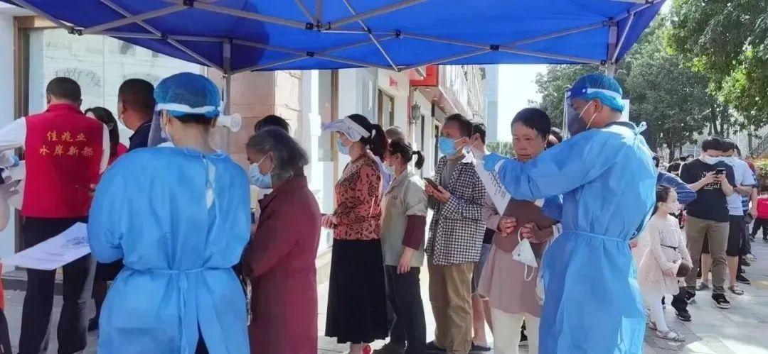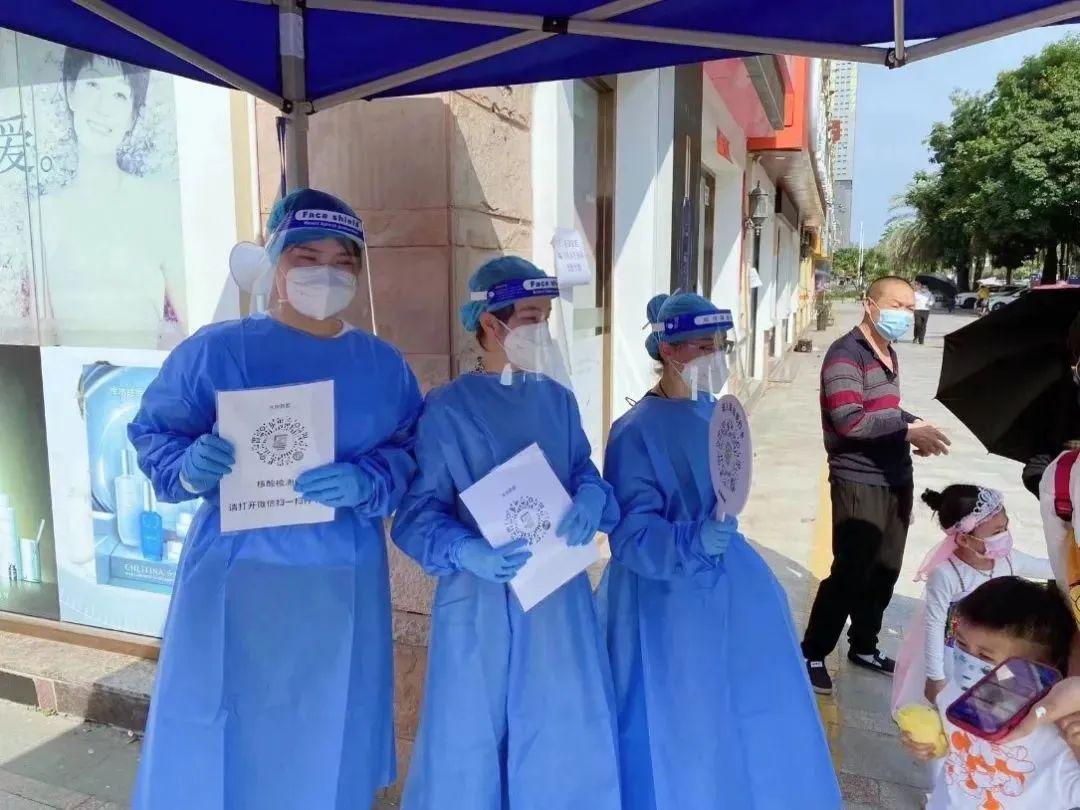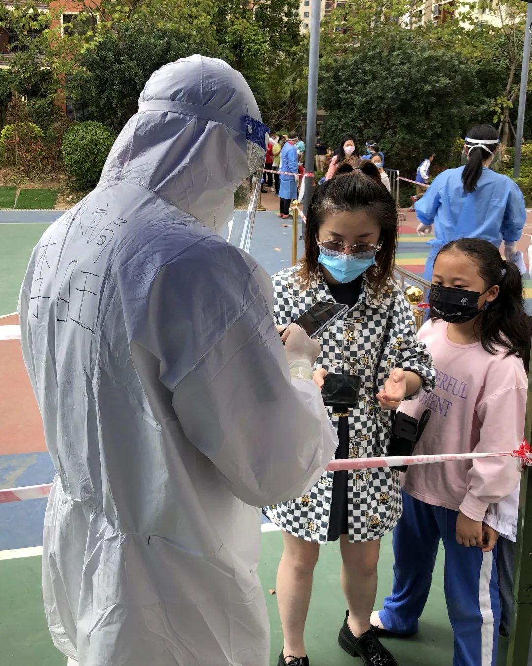 仙田外国语学校的教师们积极响应号召,在课余时间率先穿上防护服忙碌在水岸新都检测点的各个角落。他们主要负责提醒市民范佩戴好口罩、打卡场所码及检测码,协助现场工作人员维持秩序。