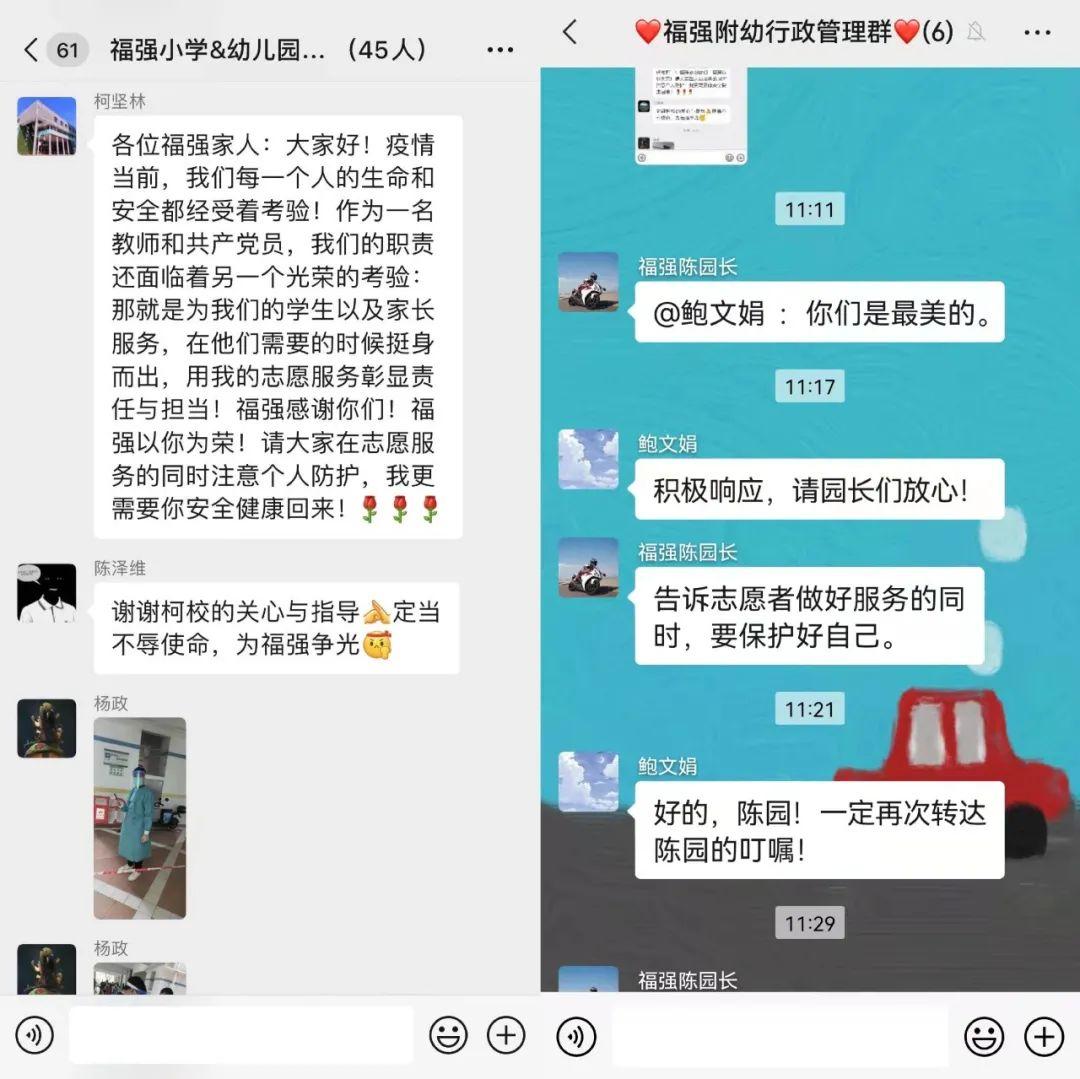 用实际行动诠释新时代教育人的责任与担当,为疫情防控贡献教育力量!福强小学校长柯坚林和福强小学附属幼儿园法人代表、园长陈志雄也为志愿者教师送上了暖心慰问和鼓励。