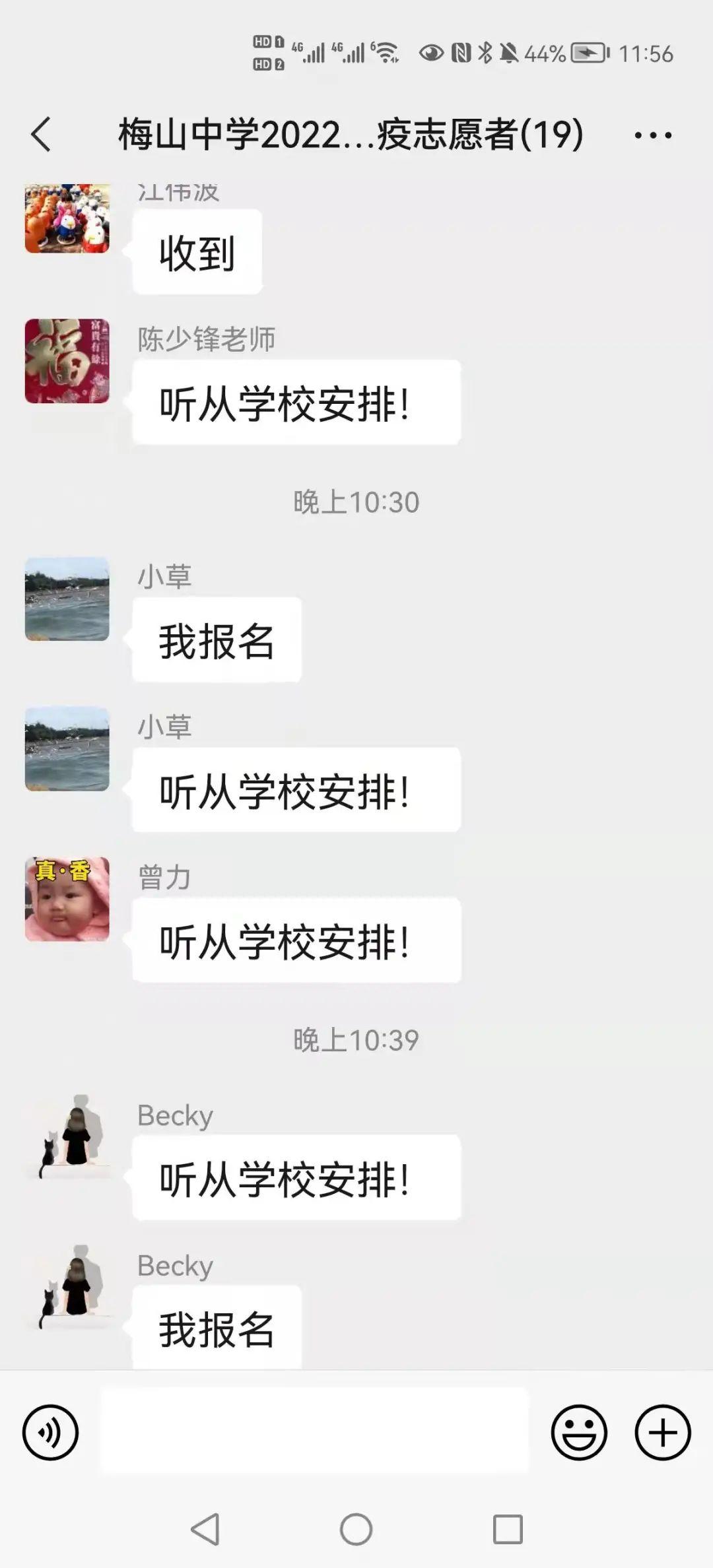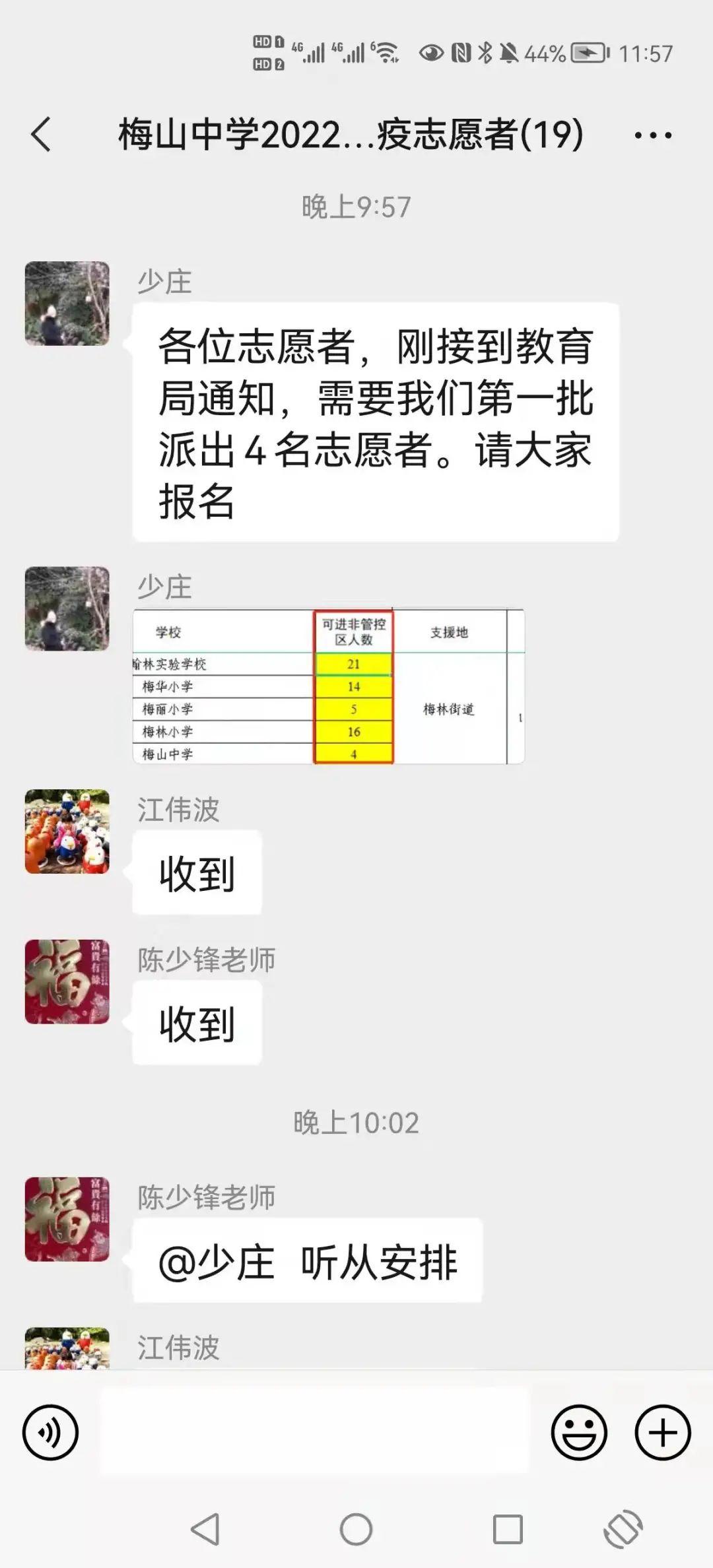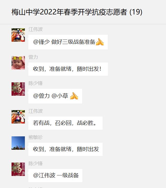 开学以来,深圳疫情卷土而来,疫情防控形势严峻复杂,工作任务艰巨繁重,在这场关乎每个福田人的“战争”中,在这场没有硝烟的抗疫战场上,梅山人再次迅速行动:2月24日,一接到《再次征集教师志愿者参与疫情防控工作的动员令》,梅山中学马上成立了由14人组成的志愿者队伍,大家纷纷表示“随叫随到”“服从命令听从安排”“有战必召回”,奋袖出臂做好出发准备;25日,11人的先头部队已经加入到福田区抗疫群;26日,区教育局在志愿者库中选出陈少锋、曾力、江伟波作为抗疫先锋队,先锋队时刻准备着到条件艰苦的管控区。