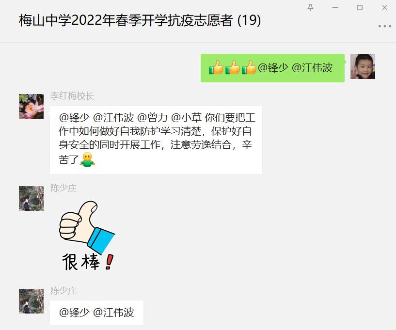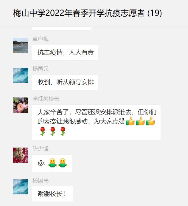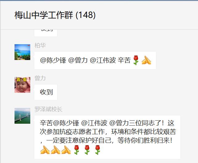 出发前,校长李红梅和全体教职工给予了温暖的叮嘱,李校说:“当前我区疫情严峻复杂,教育局已向全区各校发起了第二次动员令,陈少峰、江伟波、曾力还有多位教职员工在学校一发出动员令之后就积极响应,做好准备随时听命出发,非常感谢老师们用最有力的支持、最勇敢的行动来诠释梅山人的担当精神!希望先行出发的同志做好自我防护,听从社区指挥,高质量完成抗疫任务,平安健康归来!“