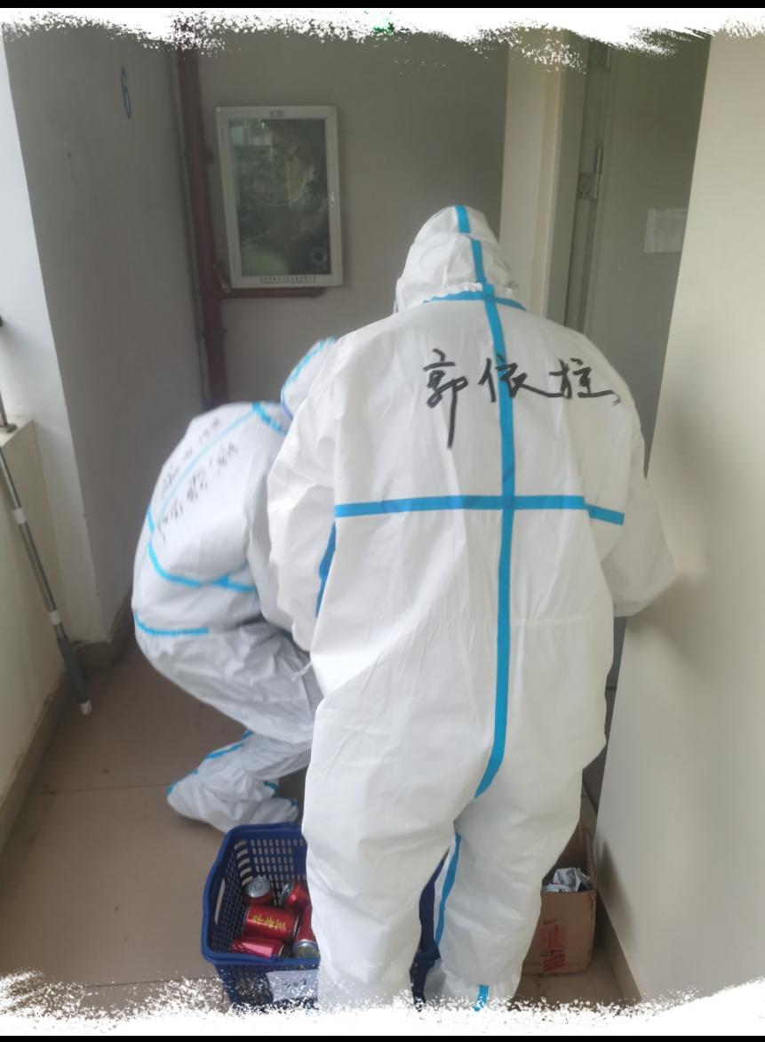 疫情期间,最多的就是与大家一起分享抗疫经验,比如怎么能把工作效率提高,怎么更好地合作协调。我的任务,是把餐和快递送到居民手中,在1楼到7楼之间上上下下好几回,常常感觉到防护服里已经裹满了汗水,就算这样,我们小分队里也没有一人说累。