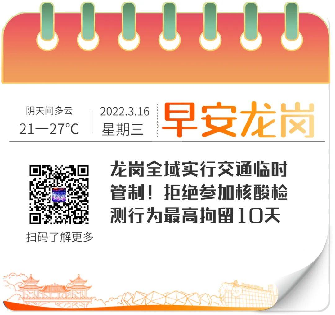 龙岗发布最新通告明确从3月16日至20起期间,全区严格实施社区卡口管理,居民除采核酸、取快递、倒垃圾外,原则上“足不出户、足不出栋”;辖区全域实行交通临时管制,车辆“凭证通行”,非必要不上路;严格实施“七天三检”核酸筛查。详情点>>>