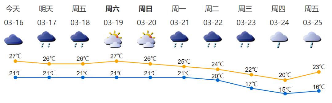 ●3月16日,我市阴天间多云;气温21~27℃;偏东风2~3级;湿度65%~95%;能见度普遍在10~20公里,云量增多,白天不宜晾晒。3月17日至22日温暖湿润,间歇性小雨逐渐增多,其中17日夜间至18日早晨有短时阵雨伴零散雷暴;18日夜间到19日早晨有轻雾或雾。