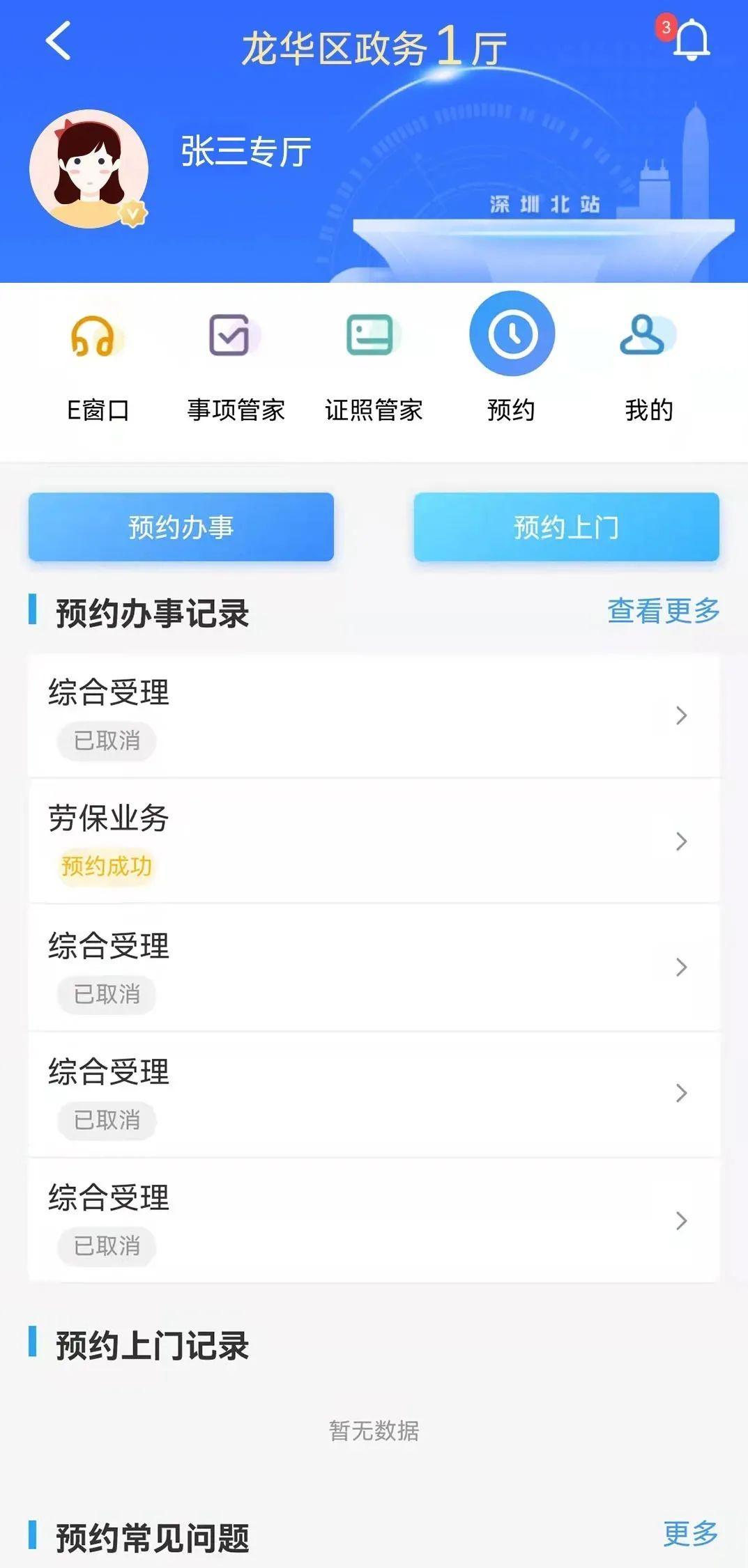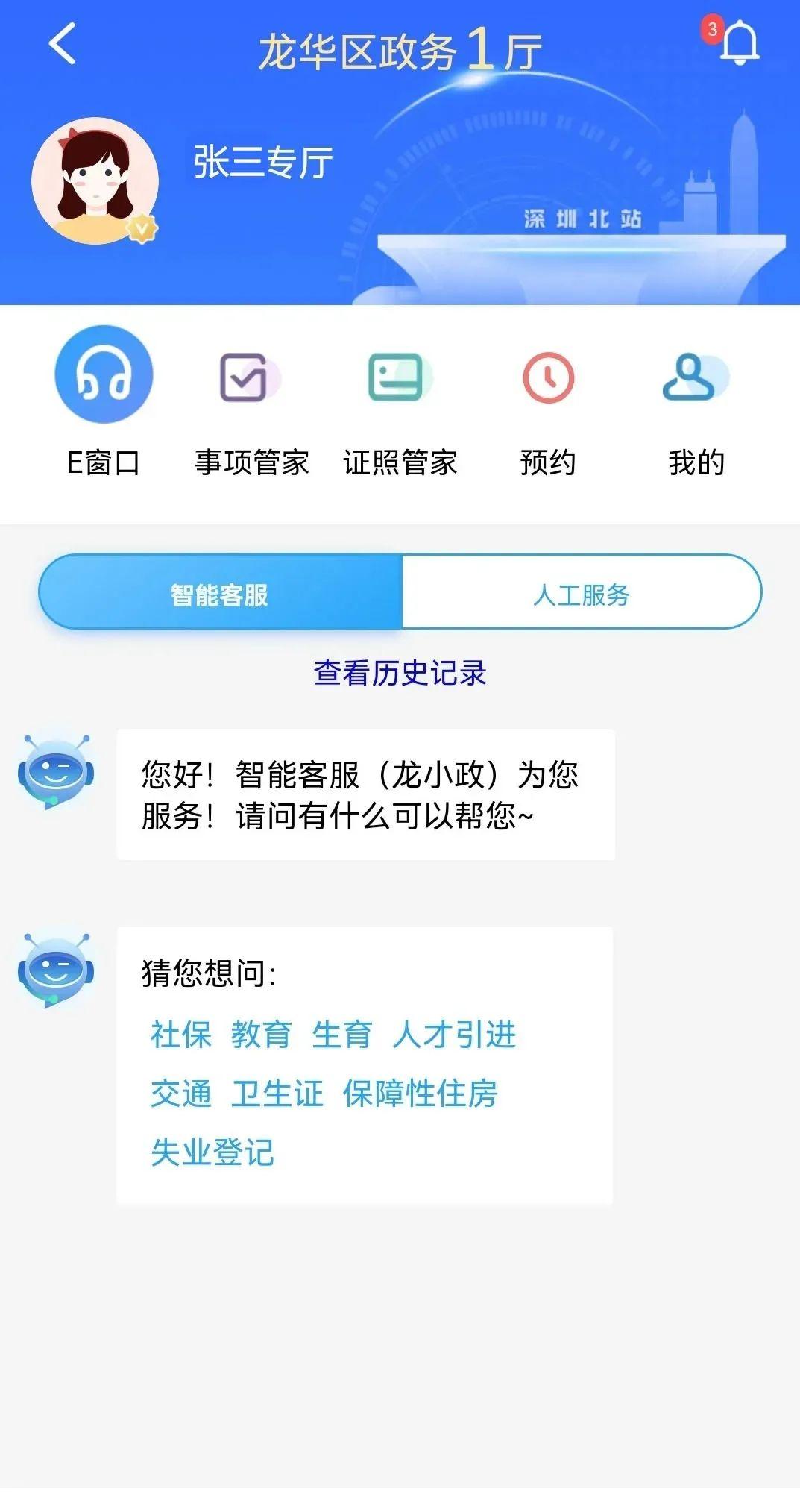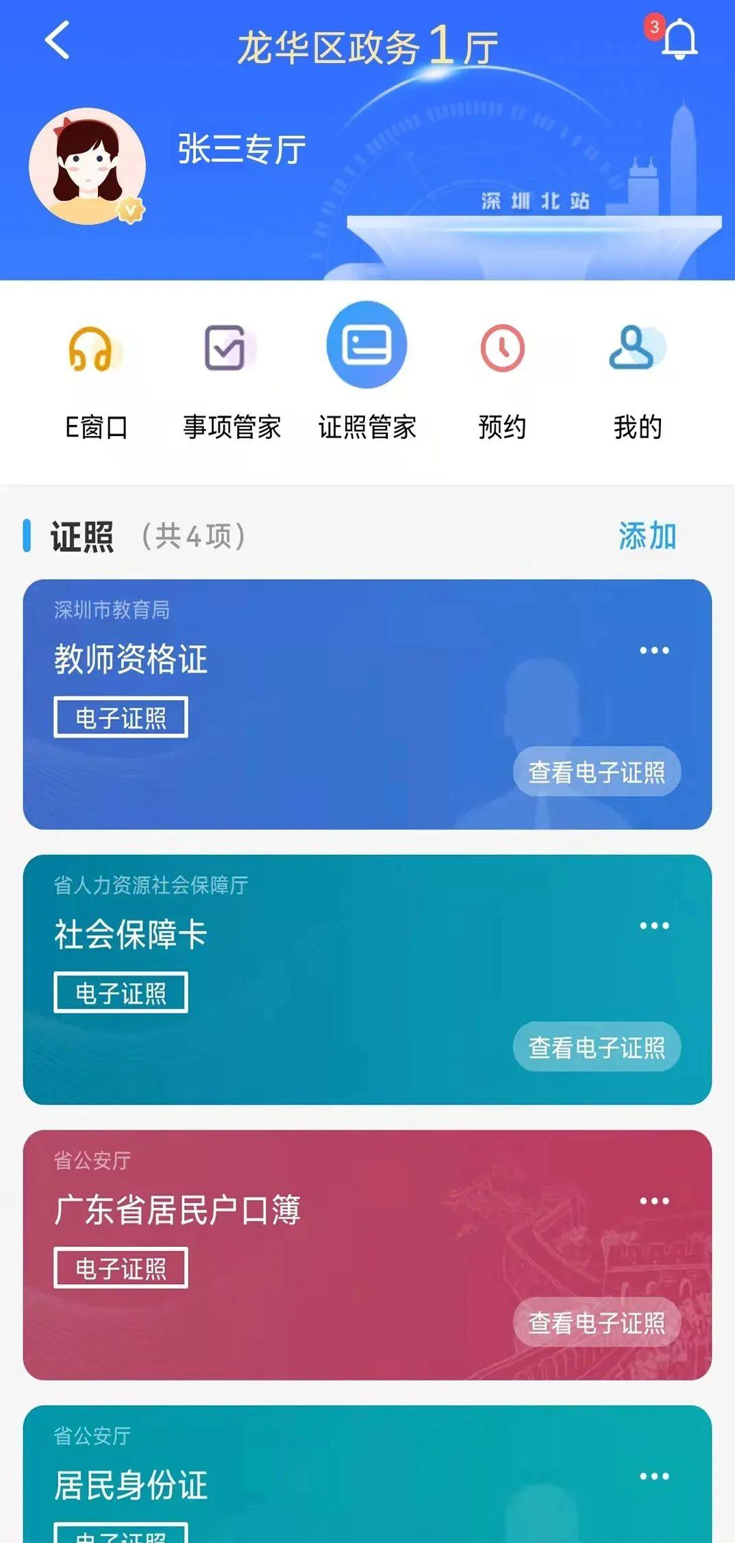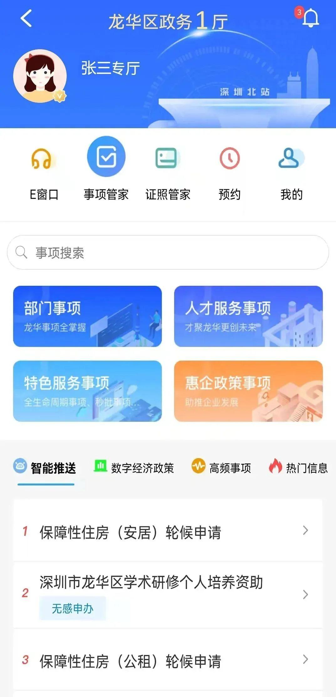 龙华“政务1厅”是依托“i深圳”APP为企业、群众打造的一个专属、便捷、高效、多元的掌上政务服务空间,包含E窗口、事项管家、证照管家、预约和我的等五大功能模块,实现“一人一厅、一企一厅”服务。