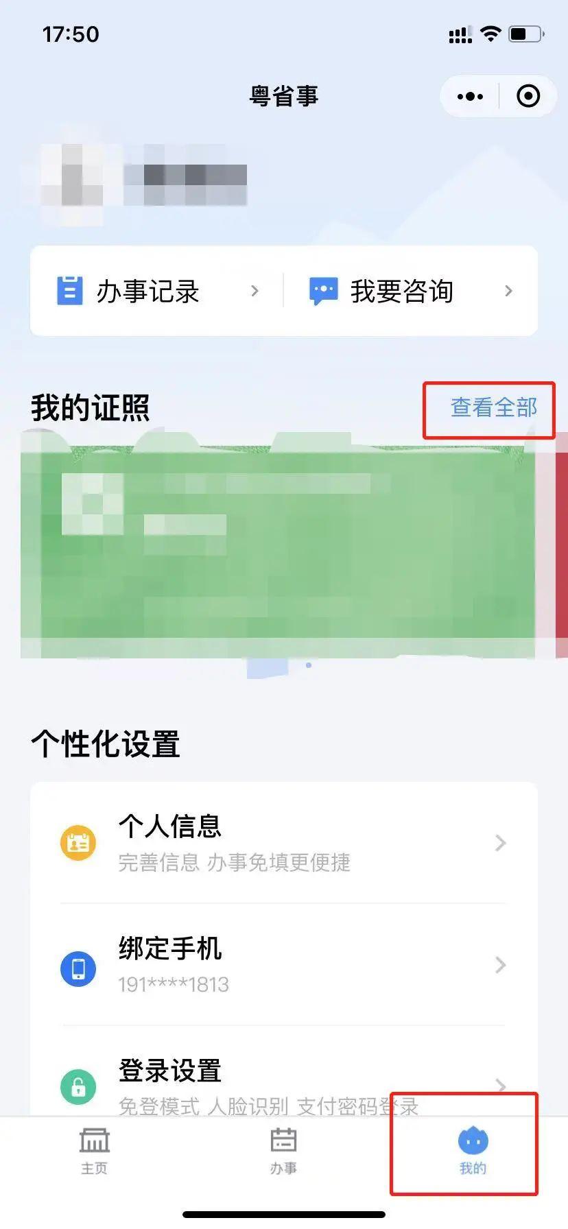 1.在微信搜索并进入“粤省事”小程序,在“我的”点击“查看全部”;