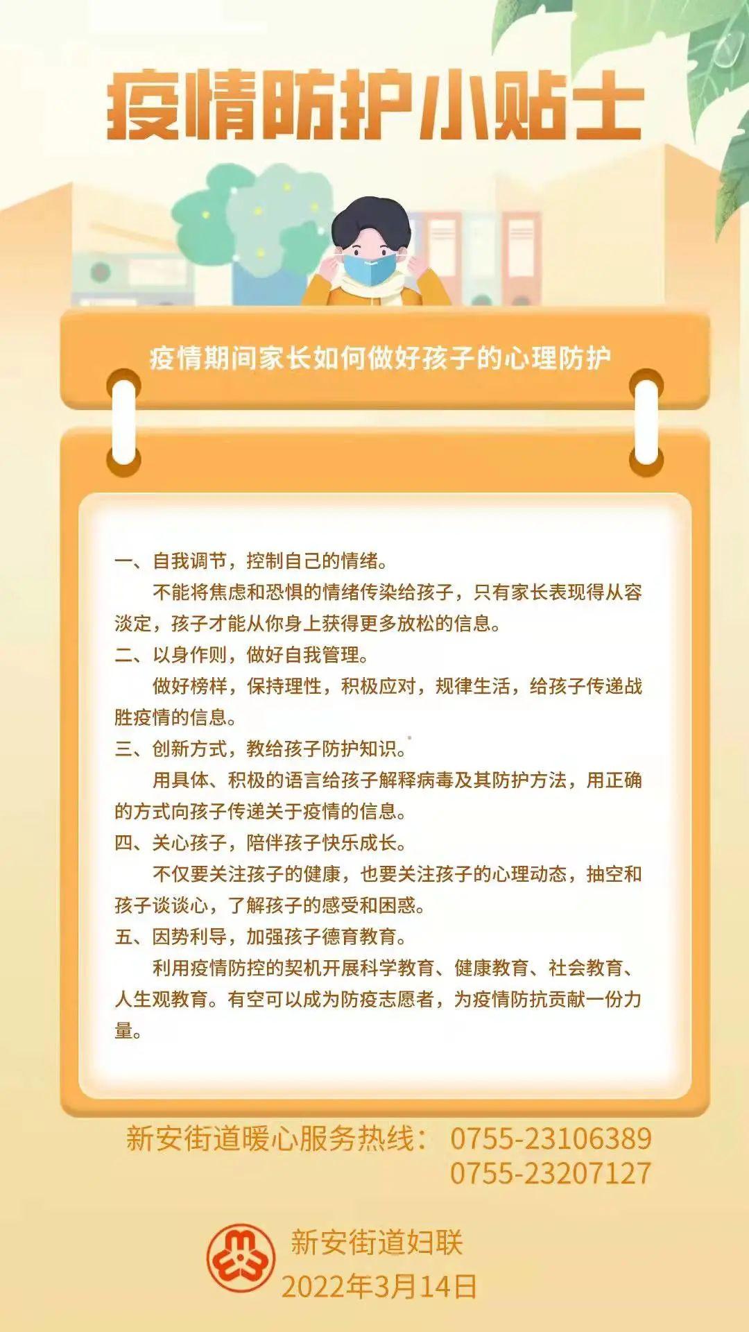 制作疫情防护小贴士,包括学会自我调节、做好自我管理、创新教育方式、陪伴孩子成长、加强孩子德育教育五方面,为家长在疫情期间做好孩子心理防护提供有效指引。