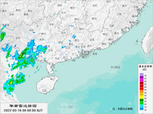 3月17日,粤北市县有雷阵雨,局部有中到强雷雨,雷雨时局地伴有6~8级短时大风,其余市县多云,有分散的(雷)阵雨。大部分市县早晚有轻雾。最低气温:珠江三角洲和粤西市县20℃~22℃,其余市县17℃~20℃。