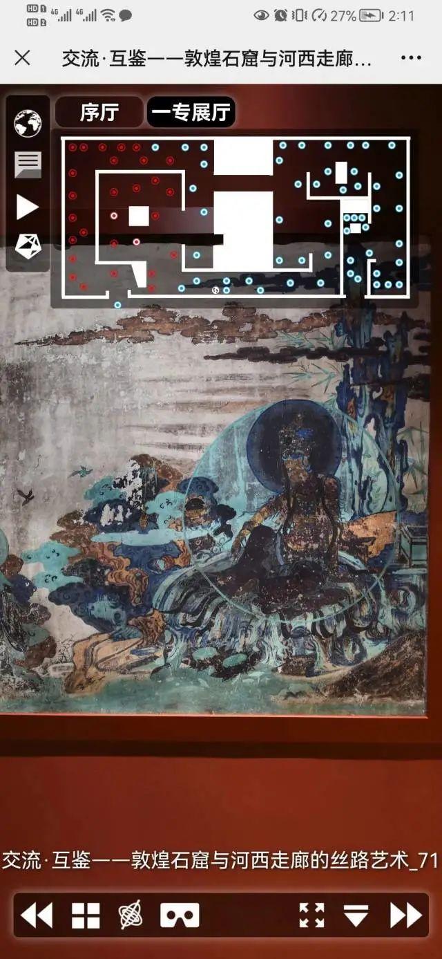 以敦煌展为例,沿着地面的箭头示意,就能按策展顺序看展啦~还可以开启VR模式,实现沉浸式看敦煌展。