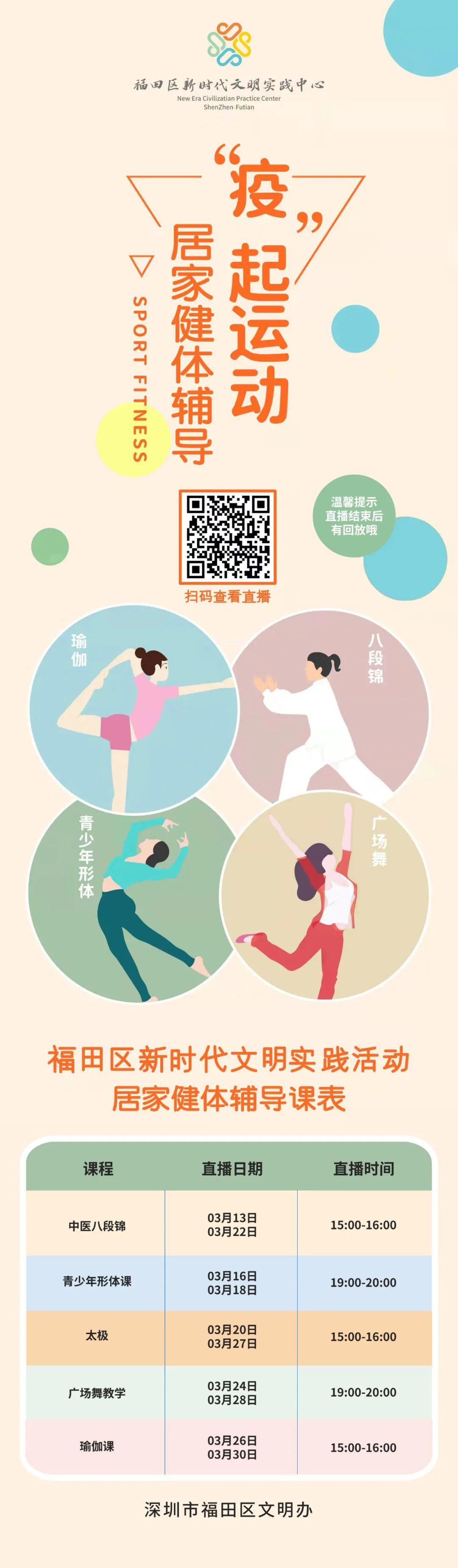 3月13日,新时代文明实践活动居家健体辅导直播活动正式上线!健身达人、形体专家纷纷现身科普教学,带来众多实用干货~向下滑动查看直播日程表,一起快乐“云健身”吧!(温馨提示:错过直播的朋友们还可进入直播间回放观看哦)