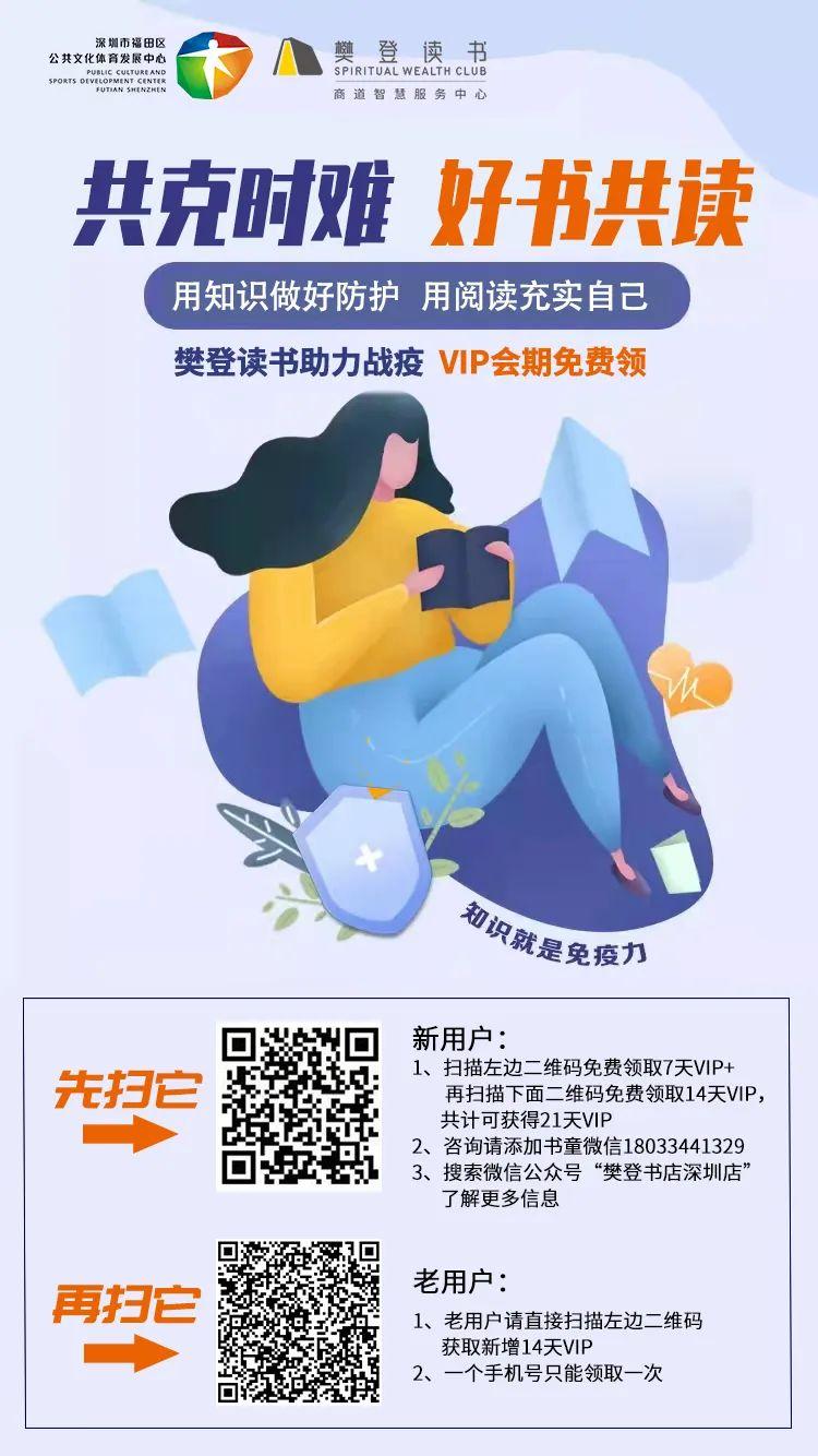 为了帮助市民朋友丰富居家生活,弥补线下文化活动和服务的缺失,福田区公共文体中心联合樊登读书(深圳樊登书店),向全市居民推出8万张福田文体中心与樊登读书联名书卡,陪伴大家度过7天难忘的居家之旅。