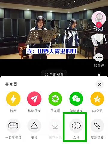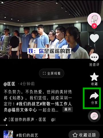 ✓第三步:选择深美行知合唱团演唱的《如愿》、文化志愿者表演的手势舞、深圳大白表演的沙雕舞(任选其一),点击页面右侧的分享按钮,然后在出现弹窗中选择“合拍”选项,进入合拍页面;