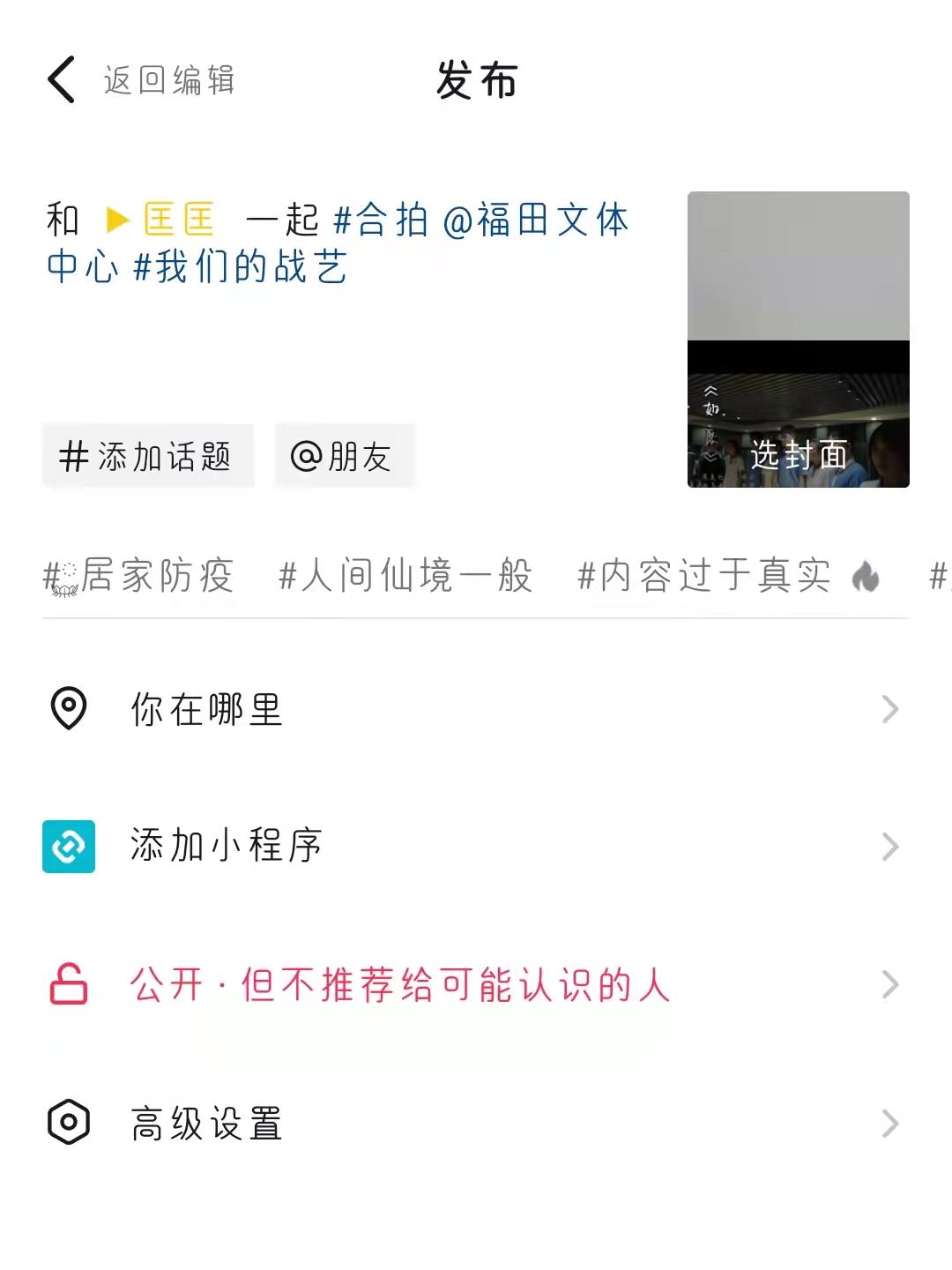 发布合拍作品按照系统提示对视频进行编辑,同时在文案中附带#我们的战艺 话题并@福田文体中心,即可发布。